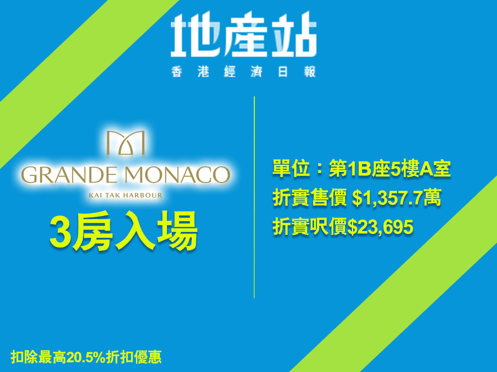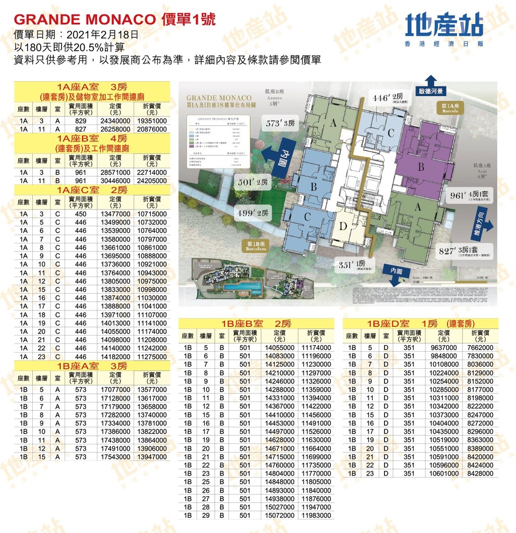 首張價單只有2伙折實平過800萬元,入場單位屬於GRANDE MONACO第1B座5樓D室,面積351平方呎,180天即供折實766.2萬元,折實呎價21,829元。