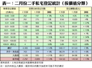 今年二月份,按二手私宅價值分類,9個價格組別的買賣登記量錄得六升三跌,升者當中,以2,001萬至5,000萬元的組別升幅最大,由一月的96宗增加35%,至上月的130宗;其次,401萬至600萬元的組別亦升23%至1,190宗,成為最旺的登記銀碼組別。至於錄得跌幅最顯著者為銀碼逾1億元以上的組別,月內只錄4宗,按月挫半。