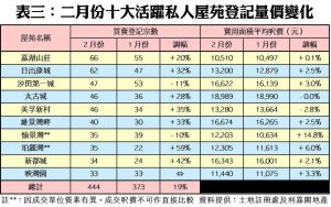 此外,上月十大活躍二手私人屋苑登記量錄七升兩跌一持平,其中以珀麗灣的升幅最大,月內有35宗登記,較一月的22宗大增59%;至於居於榜首的嘉湖山莊,月內錄得66宗登記,按月升20%,穩佔龍頭地位。此外,新都城及美孚新村上月登記分別大升42%及35%,各自錄得34宗及46宗登記,成為登記量第二及第三大升幅的屋苑。