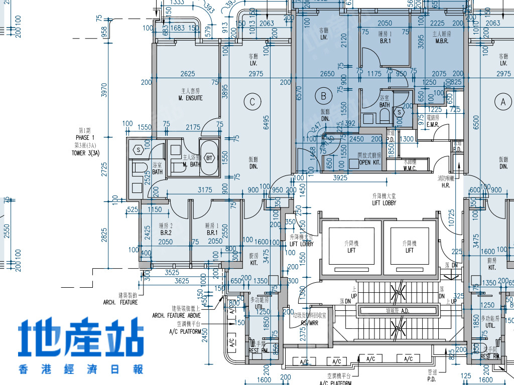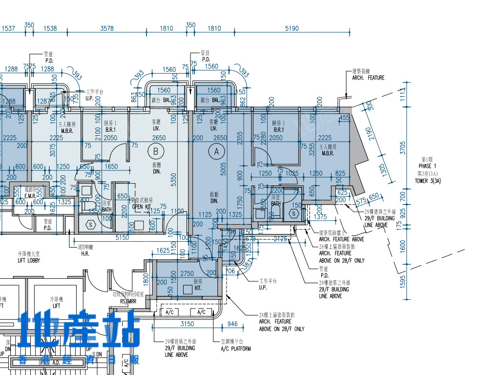 | A室 | 794 | 3房(連套房)及工作間連廁 | 東南偏南方+西北偏北方 |