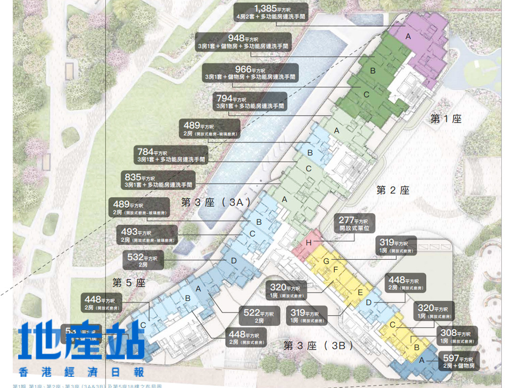 | 3B座3至9樓A室 | 597 | 21,989至22,625 | 西南偏西方 |