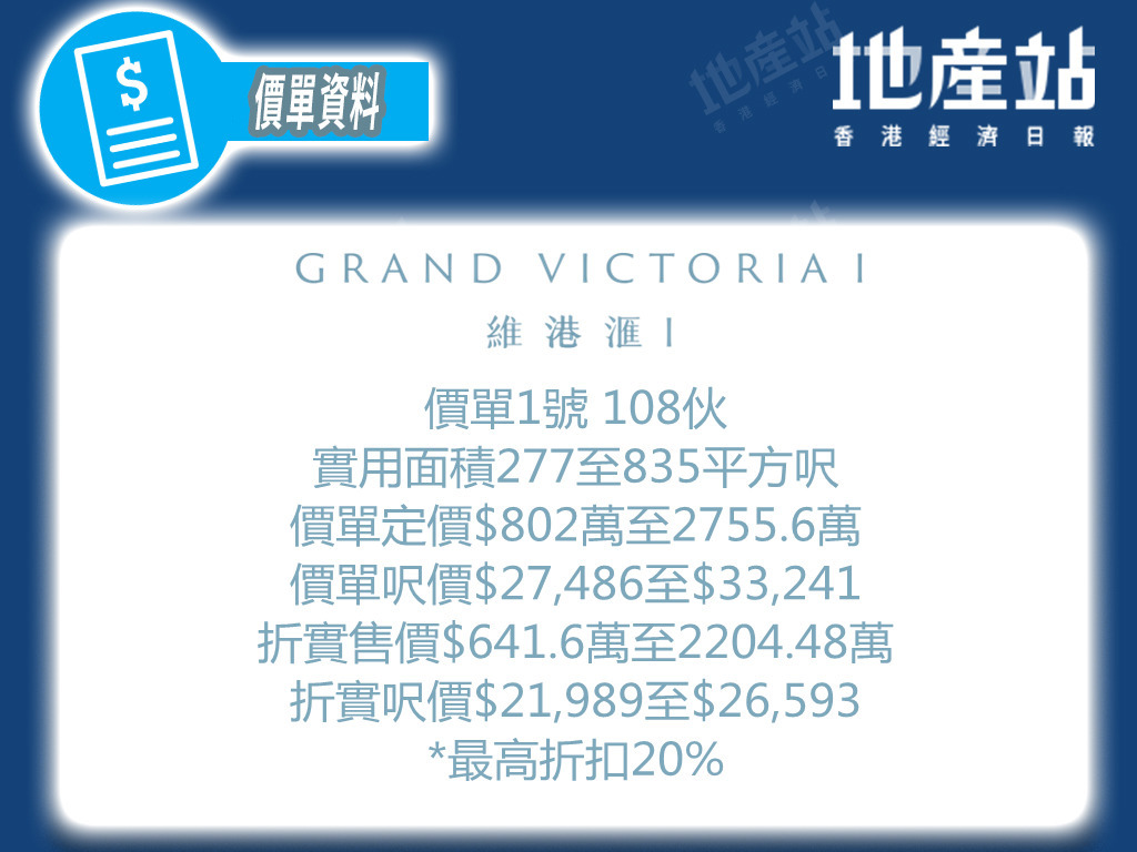GRAND VICTORIA I維港滙I(GRAND VICTORIA維港滙第1期)位置在西南九龍荔盈街6號及荔盈街8號,提供524伙單位,維港滙I首張價單共108伙,包括開放式至3房單位,5大發展商提供180天即供最高20%折扣,開放式即供折實價由約642萬元起。地產站同你分析一下維港滙I價單。