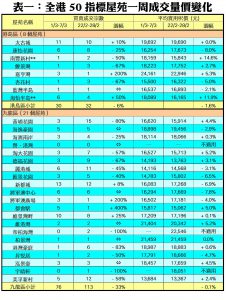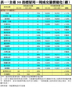 至於,港島區8個指標屋苑上周共錄30宗成交,按周減少2宗或6%,其中鯉景灣及杏花村上周各錄1宗買賣,按周分別減少67%;南豐新村交投量由前周的2宗,減少50%至上周的1宗;康怡花園則錄得6宗成交,較前周的8宗減少25%。此外,在全港50個指標屋苑當中,上周共有7個屋苑錄得「零成交」,較前周的3個增加1.33倍,當中九龍區及新界區各佔3個及4個,港島區則全線屋苑均有錄得成交(詳見表一)。