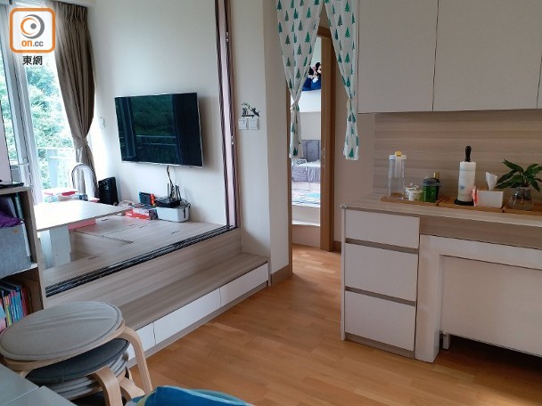 設計師在客廳劃出一半空間作多功能房,日間是影視室,晚上可化作戶主父母的睡房,同時地台可收納一家人的物品。
