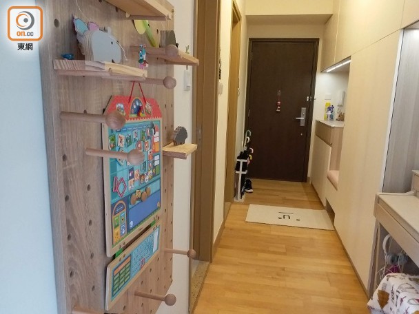 玄關的走廊有一排多功能組合櫃,收納物品之餘,同時設座位予大家坐着穿鞋。