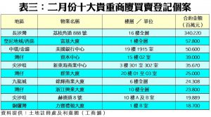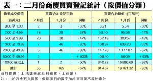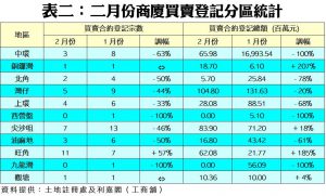 此外,因應一月份錄得一宗疑屬內部轉讓的「交易廣場」第三座全幢167.28億元巨額登記而抽高基數影響下,導致二月份商廈買賣登記金額急挫95%,錄約9.15億元,若撇除相關巨額登記後,實際跌幅為62%,登記金額為近6個月最少。二月份最矚目的單一登記項目為長沙灣荔枝角道888號16樓全層,涉及合約金額逾3.4億元。