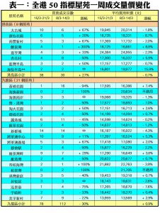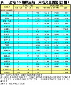 至於,港島區8個指標屋苑上周累錄38宗成交,按周增加8宗或27%,其中鯉景灣上周錄得4宗買賣,按周增幅達3倍;太古城及南豐新村各錄10宗及5宗成交,按周分別增加67%;藍灣半島交投量由前周的2宗,增加50%至上周的3宗;康怡花園及嘉亨灣則各錄6宗及4宗成交,按周分別增加20%及33%。此外,在全港50個指標屋苑當中,上周共有4個屋苑錄得「零成交」,較前周的1個增加3倍,當中九龍區及新界區各佔2個,港島區則全部屋苑均有錄得成交(詳見表一)。