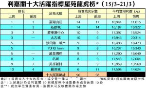 利嘉閣地產董事陳大偉表示,旺市經已持續一段時間,平價放盤陸續消化,屋苑盤源暫時未及補充,故上周二手交投略為受壓。不過,大市氣氛仍熾熱,不少買家對後市有信心,市場承接力依然強勁。綜合利嘉閣地產分行數據所得,全港十大活躍指標屋苑在上周(15/3–21/3)錄96宗買賣個案,較前周(8/3–14/3)的98宗按周微跌2%,平均每個屋苑錄得逾9宗成交。
