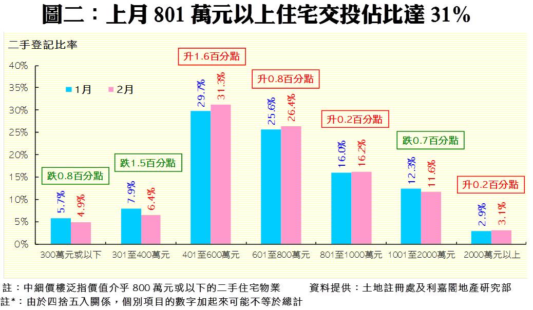利嘉閣地產研究部主管陳海潮表示,新春過後樓市轉旺,購買力擴大至換樓市場,中高價物業受捧,而超級豪宅市場亦見熱鬧,中細價樓買賣佔比連升兩月後恐墮谷底。綜合土地註冊處最新資料,2021年二月份全港共錄3,246宗價值800萬元或以下的二手住宅買賣登記,佔同期整體二手住宅買賣登記(4,702宗)比例約69.0%,按月回升0.2個百分點,連升2個月,創近5個月新高,惟連續9個月未能衝破70%的水平。