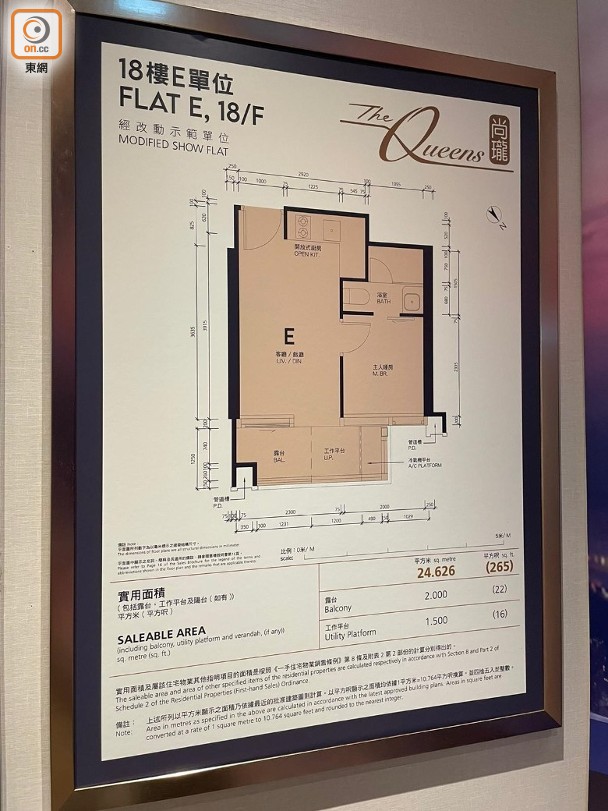 至於根據18樓E室打造的一房單位,實用面積265方呎,同樣設有面積22方呎露台及16方呎工作平台,廚房則以開放式設計,主人套房內設浴室,方便住戶使用。