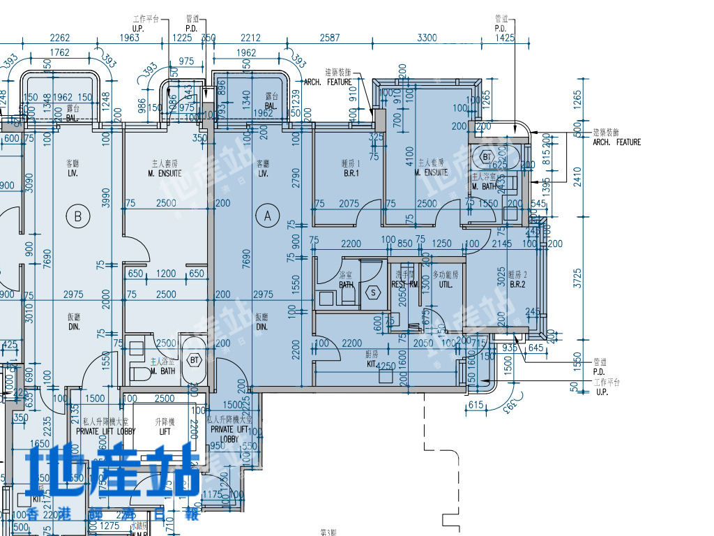 A室977平方呎,經私人升降機大堂可進入長廳,廳區長約7.69米,闊約2.975米,空間夠大,廚房設有長形,工作枱分布兩邊,連接工作平台及內有工作間連廁。經走廊連接睡房1、睡房2及主人套房,睡房2面向西北方。主人浴室採浴缸設計,並有活窗,而主人套房最大賣點是窗戶呈「冖」形。