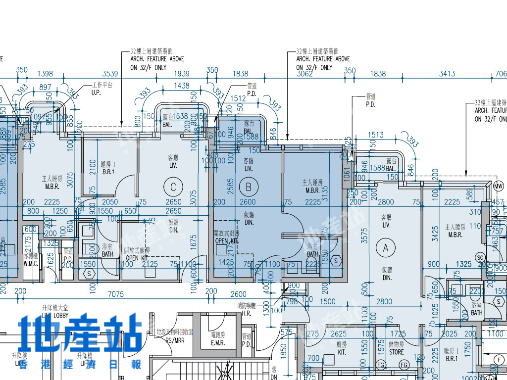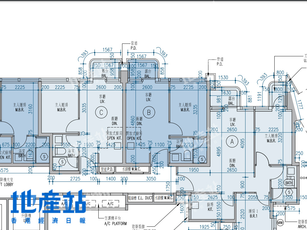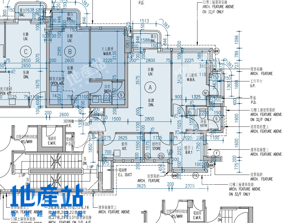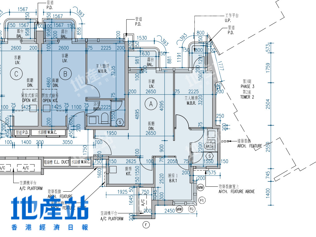 B室312平方呎,開放式廚房呈L形設計,廳區四正企理,長約4.7米,闊約2.6米,附連平台,全屋無走廊,主人房及浴室置於一邊。C室2房設計,廳區長5.3米及闊2.65米,開放式廚房設計,短走廊連接一細一大睡房,主人房已預留凹位擺放衣櫃,房外連接工作平台。