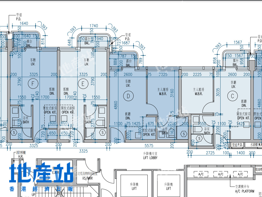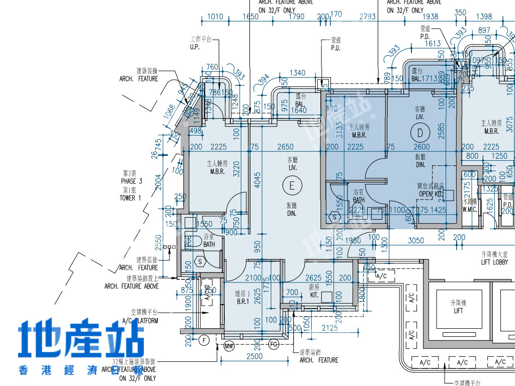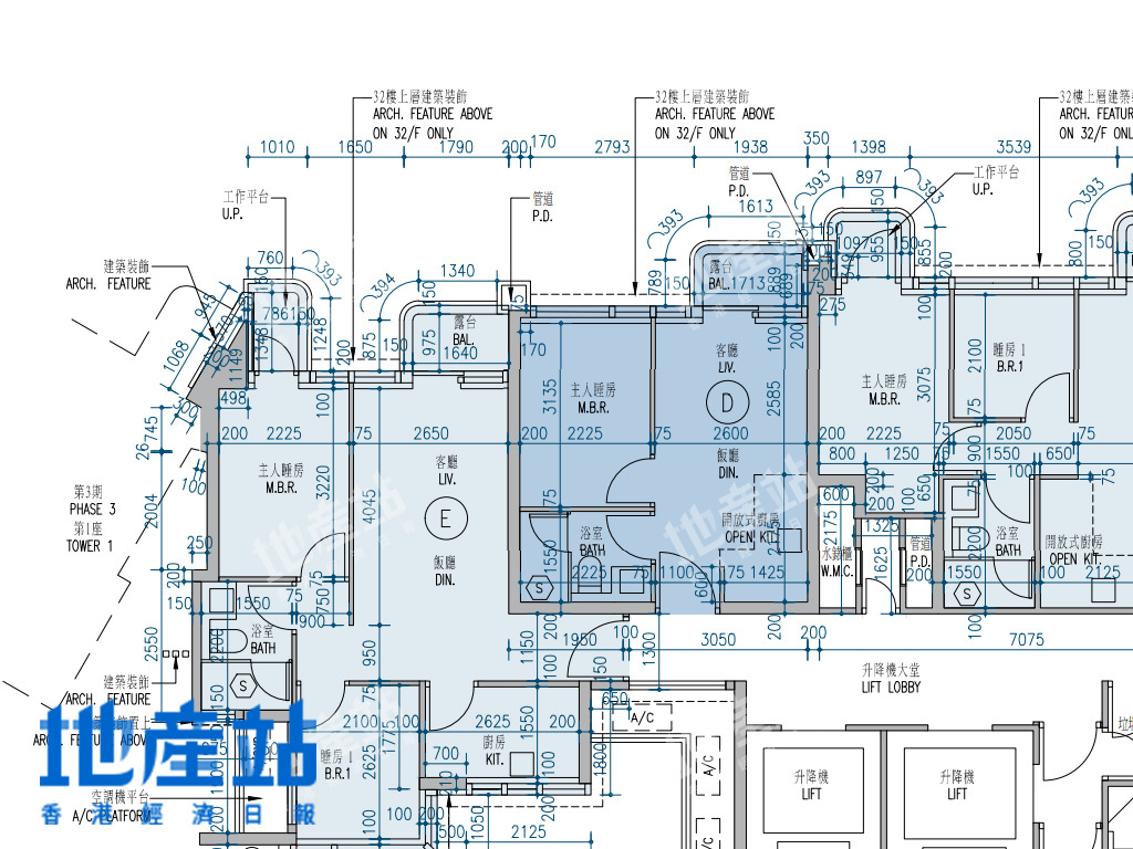 D室311平方呎,開則類近B室,僅為左右相反布局,面積則細約1平方呎。E室525平方呎,設有玄關位,不過大門未有直望浴室,浴室內有活窗,而浴室門前方有0.75米的牆身遮掩,同時增主人房私隱。單位背面為細睡房及廚房,細睡房備L形曲尺窗及冷氣機平台用的氣窗。主人睡房與廳區並排,連接工作平台。