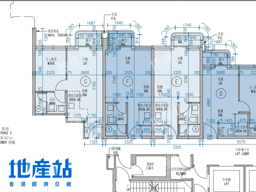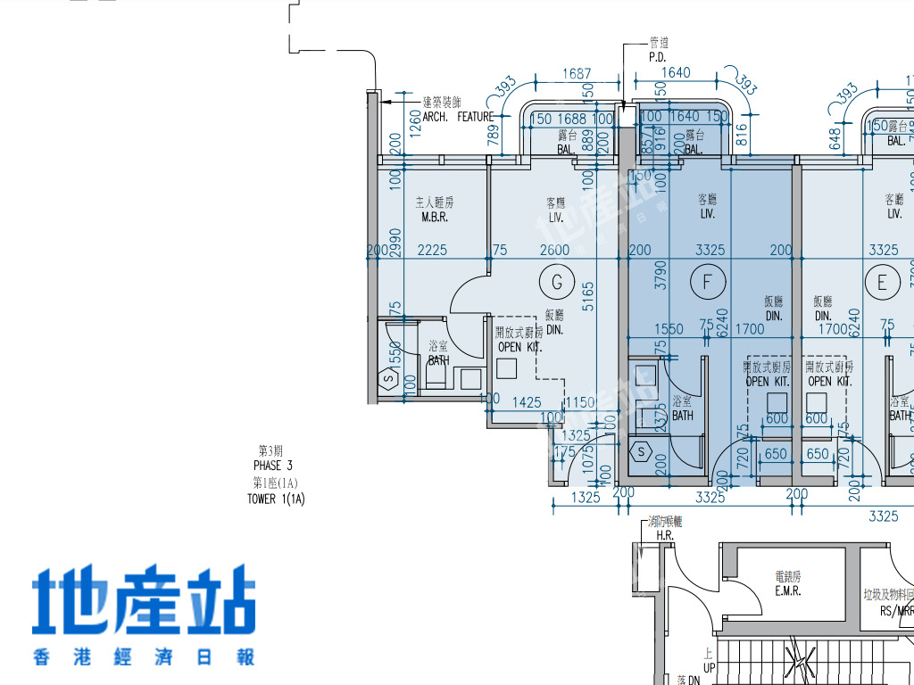 E及F室屬開放式單位,277及278平方呎,玄關位已有小櫃及開放式廚房,浴室比鄰而建,廳區方正,外連露台。至於G室(連套房)間隔,面積331平方呎,長廳設計,不設走廊,主人房內設浴室,值得留意的是主人房窗外旁有建築裝飾,或稍影響景觀。