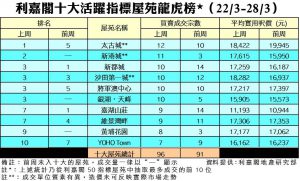 利嘉閣地產董事陳大偉表示,近日一手市場以貨尾銷售為主,暫未有焦點盤推售,購買力續回流二手,加上整體樓市旺勢一直延續,指標屋苑單位放盤不乏買家承接。不過,因應盤源供應越來越少,二手成交量未再有大突破,只維持在高位徘徊。綜合利嘉閣地產分行數據所得,全港十大活躍指標屋苑在上周(22/3–28/3)錄96宗買賣個案,較前周(15/3–21/3)的91宗按周微升5%,平均每個屋苑錄得逾9宗成交。
