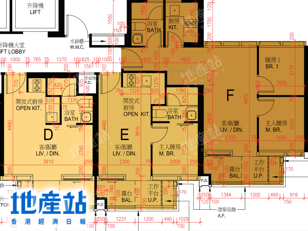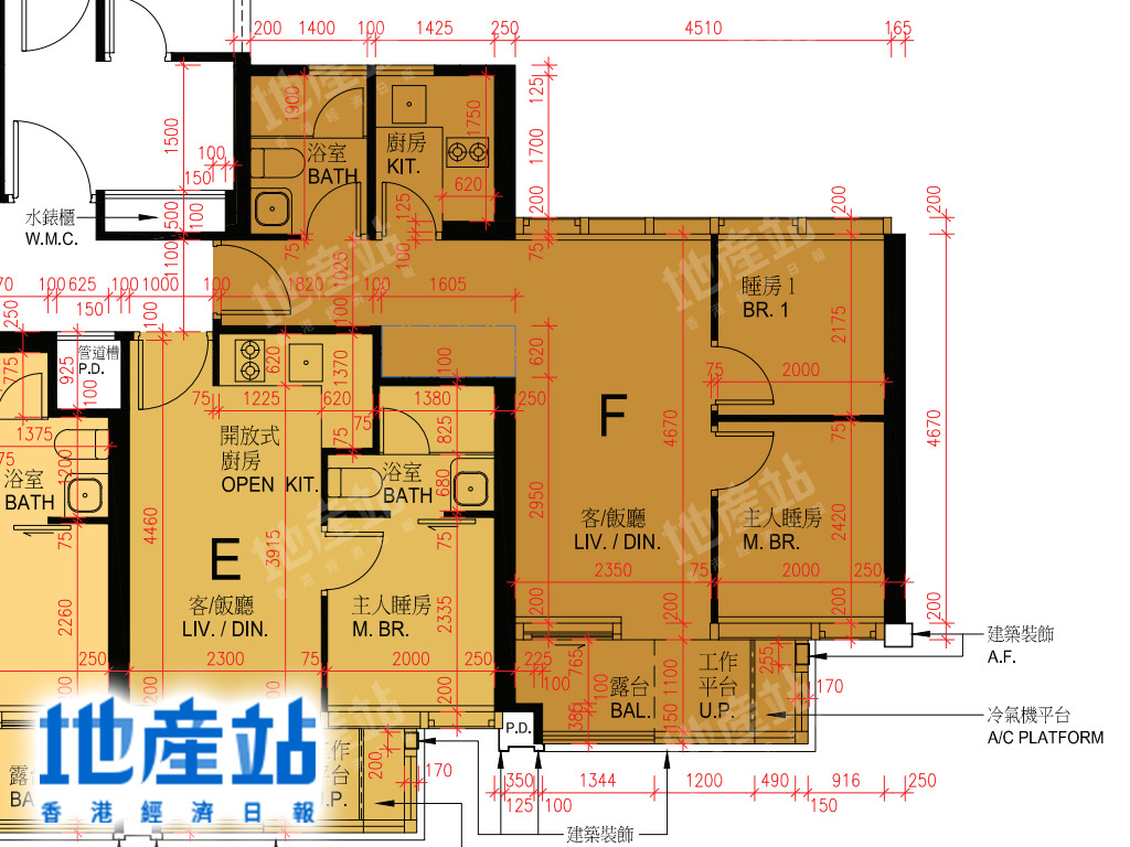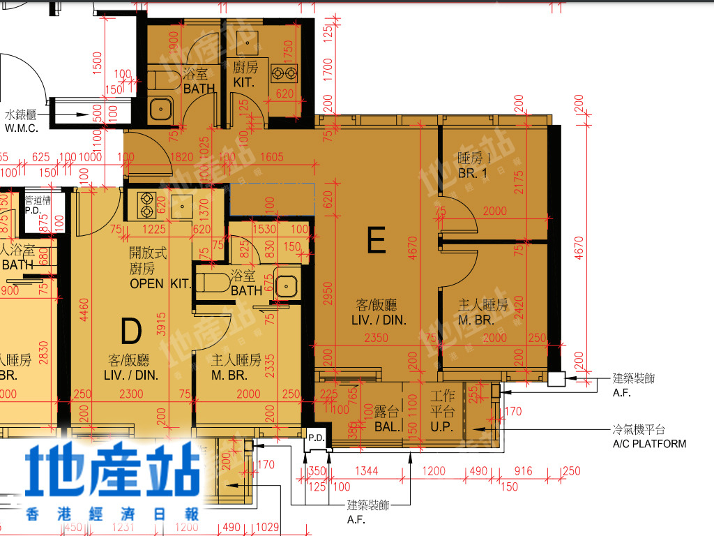 D室屬開放式,廳區連開放式廚房位置呈L形布局,開放式廚房斬開分設兩邊,廳區闊約3.9米,不過露台及工作平台門口位設於正中,故廳區布置或只能沿牆而擺。E室同樣265平方呎,布局與B室左右相反,大致一樣。