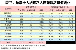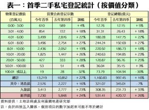 按樓價劃分,今年第一季在9個樓價組別當中,錄得8升1跌,值得注意的是,2,001萬至5,000萬元的中高價豪宅組別錄得最大的升幅(見表一),首季共有427宗買賣登記,按季大升28%;而介乎1,001萬至2,000萬元者亦錄得26%的升幅,買賣登記達1,825宗,反映千萬元以上私宅交投大有增加。至於受惠放寬按保樓價上限,401萬至600萬元及601萬至800萬元的兩個樓價類別仍為最受歡迎的選擇,且兩者平分秋色,各錄近3,500宗登記,亦雙雙按月升逾兩成。