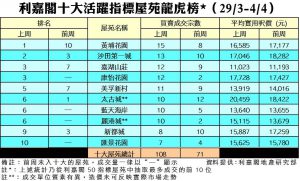 利嘉閣地產董事陳大偉表示,疫情下港人難以外遊,惟有留港消費,而且樓市交投氣氛暢旺,吸引有意置業人士趁長假期出動覓盤,整體入市氣氛相當正面。綜合利嘉閣地產分行數據所得,全港十大活躍指標屋苑在上周(29/3–4/4)錄108宗買賣個案,較前周(22/3–28/3)的71宗按周上升52%,平均每個屋苑錄得近11宗成交。
