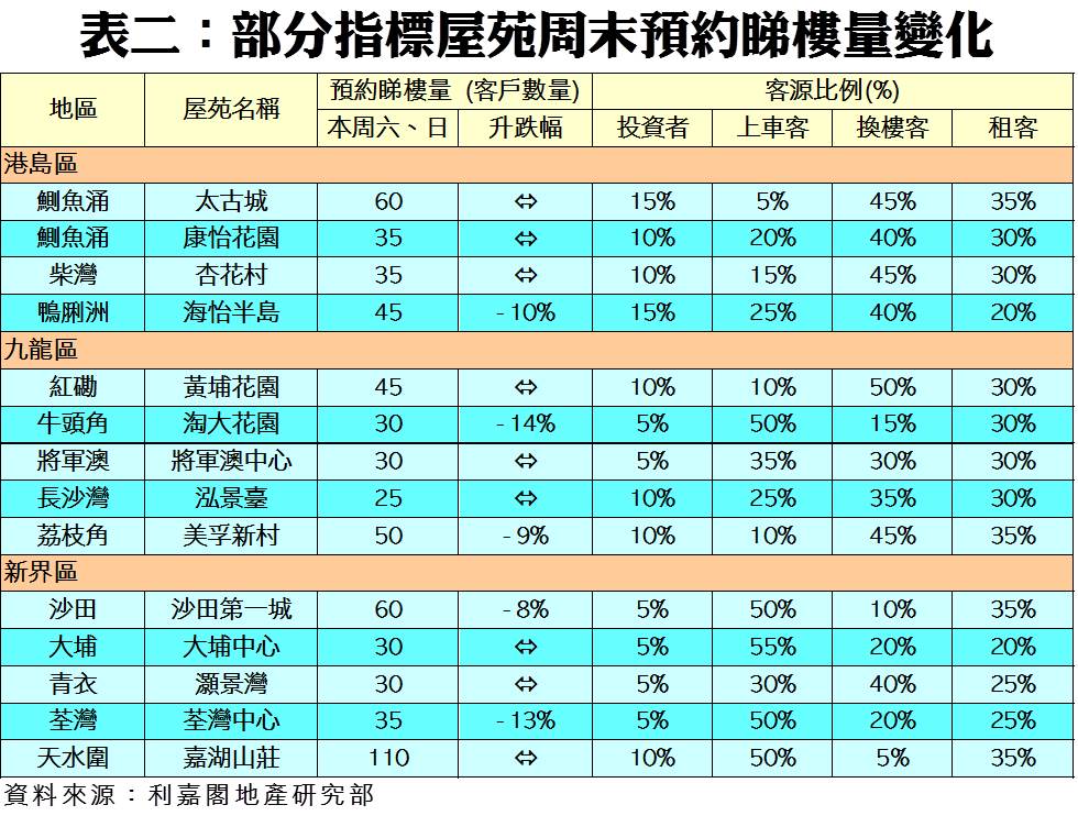 二手去貨速度加快 屋苑普遍缺盤 50指標屋苑周末預約睇樓量微跌1.6%