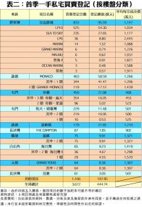 按樓盤分類,今年首季應市新盤中,以新界區佔比最多(62.6%),當中日出康城發展區多個項目合計錄得最多的833宗登記,涉及登記總值95.59億元,平均每宗成交價約1,147萬元。若以個別單一項目計,則以「LP10」的525宗最多,涉及登記總值54.30億元,平均每宗成交價約1,034萬元,其次為「帝御‧嵐天」的354宗及「MONACO 1期」的344宗,各列第二及第三位。此外,在首季的十大熱賣新盤當中,平均每宗成交價最高者為「LP6」,期內錄得36宗登記,平均每宗涉資2,445萬元;而「帝御‧嵐天」的453萬元則成為較低平均價者(見表二)。