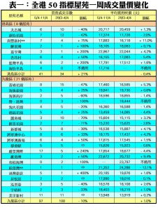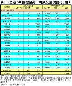 至於,港島區8個指標屋苑上周共錄41宗成交,按周增加21%,其中嘉亨灣及藍灣半島各錄3宗及6宗買賣,按周增幅分別達2倍;鯉景灣錄得2宗交投,較前周的1宗增加1倍;南豐新村及杏花村成交量則分別按周增加75%及50%,各自錄得7宗及6宗買賣。此外,在全港50個指標屋苑當中,上周共有6個屋苑錄得「零成交」,較前周的5個增加20%,當中九龍區及新界區各佔2個及4個,港島區則全線屋苑均有錄得成交(詳見表一)。