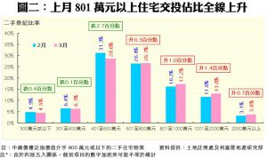細看三月份數據,在7個銀碼組別中(見圖二),中細價物業的兩大主流銀碼佔比一跌一升,其中銀碼介乎401萬至600萬元物業的跌幅最大,佔比由31.3%急跌2.7個百分點,至28.6%;而銀碼介乎601至800萬元者則只微升0.3個百分點至26.7%。不過,中高價物業交投佔比則全線上升,其中銀碼介乎1,001萬至2,000萬元的組別升幅最顯著,按月升1.4個百分點,至13.0%;而801萬至1,000萬元及2,000萬元以上者亦分別升1.0個百分點及0.7個百分點,可見逾千萬元物業買賣佔比趨活躍。