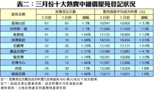 以屋苑層面分析,上月十大熱賣中細價屋苑登記量則錄得九升一跌,當中登記量升幅最顯著者為荃灣中心,交投量按月大增86%,錄26宗登記;其次,港灣豪庭及新都城亦分別升68%及64%,分別錄32宗及41宗登記。至於一哥常客嘉湖山莊則只微升3%,但仍以67宗之數繼續守在最熱賣中細價屋苑榜首位置(詳見表二)。