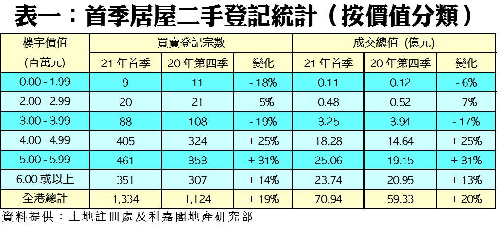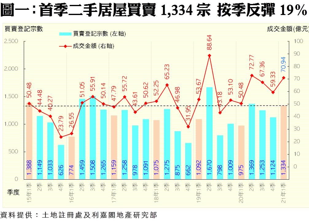 利嘉閣地產研究部主管陳海潮表示,隨著疫苗面世,經濟活動有望重啟,加上各國央行不斷「印銀紙」,資金對樓市態度保持熾熱,用家亦重拾信心入市,帶動資助房屋交投表現造好。根據土地註冊處最新數據,今年首季全港錄得1,334宗居屋二手買賣登記,較去年第四季的1,124宗大增19%;而季內物業成交總值約70.94億元,按季增加20%,量值同屬近3個季度最多。若以首季同期比較,成交量值則按年分別增加37%及41%,成交量屬近6年同期最多,而金額更創下1996年以來最多的首季。