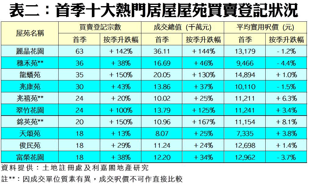 在今年首季十大活躍成交的居屋屋苑當中(詳見表二),所有買賣宗數按季均錄得增幅,其中鑽石山龍蟠苑及馬鞍山錦英苑的登記量升幅最大,按季同樣急增150%至35宗及20宗成交,期內成交總值分別為20.05及10.96億元,按季分別增加130%及167%。至於九龍灣麗晶花園錄63宗買賣,大幅拋離同儕,成為第一季交投活躍屋苑之首。
