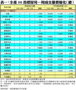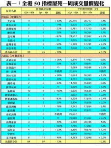 至於,新界區21個指標屋苑上周共錄71宗交投,按周增加1宗或1%,其中錦繡花園上周錄得3宗成交,較前周的1宗增加2倍;銀湖‧天峰交投量由前周的2宗,增加1倍至上周的4宗;沙田第一城及盈翠半島上周分別錄得8宗及7宗買賣,按周各自增加60%及75%;名城的交投量由前周的2宗,增加50%至上周的3宗;藍天海岸期內錄得6宗買賣,較前周的5宗增加20%;惟嘉湖山莊錄得10宗成交,按周輕微減少9%。此外,在全港50個指標屋苑當中,上周共有3個屋苑錄得「零成交」,較前周的6個減少50%,當中新界區佔全數3個,港島區及九龍區則全部屋苑均有錄得成交(詳見表一)。