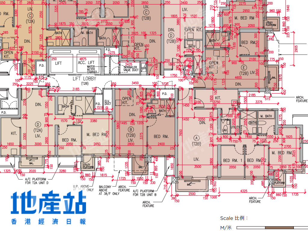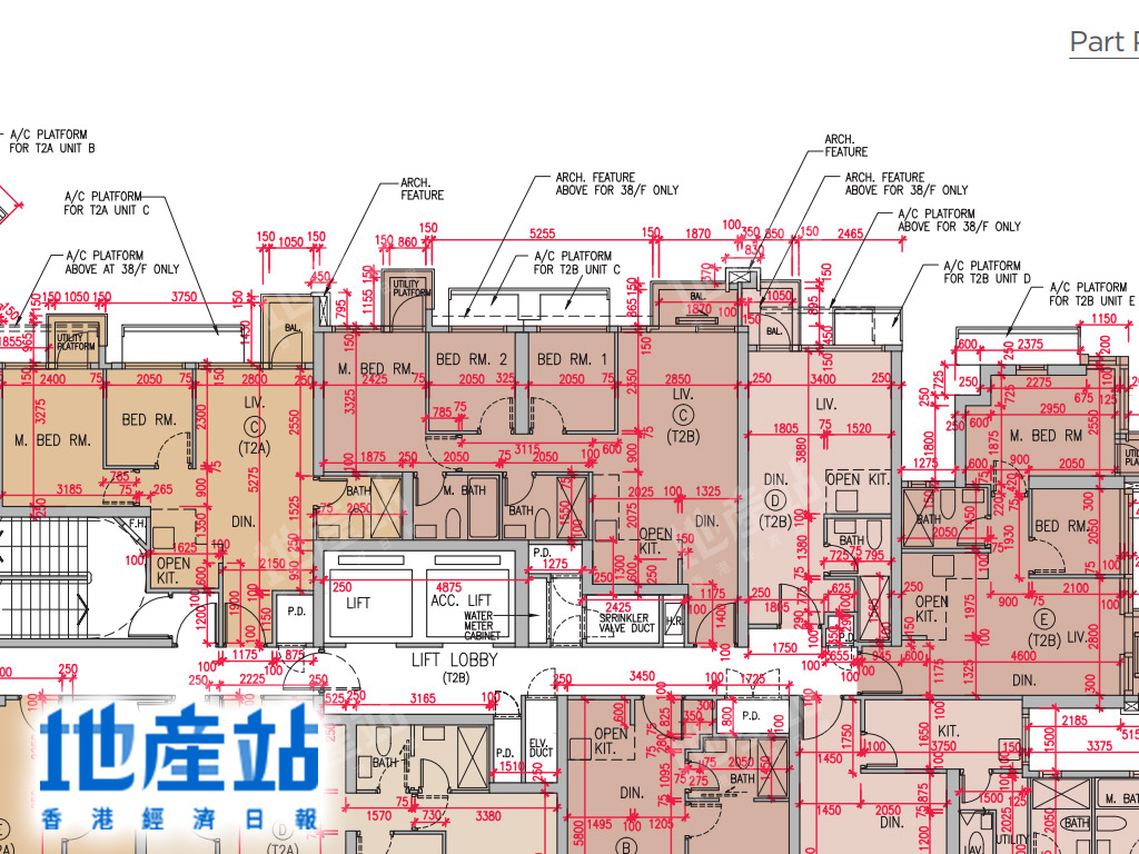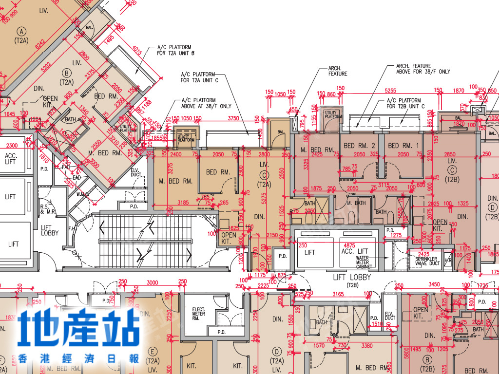 3房方面,2B座C室639平方呎單位屬入場版3房,經玄關位連接大廳,飯廳旁屬L形設計的開放式廚房,走廊連接2間睡房及主人套房,兩間細睡房外有冷氣機平台,有興趣人士要留意;2A座6至38樓A室766平方呎,大廳空間明顯較大,長約7.6米及闊3.5米,主人套房設曲尺賞景窗;2A座6至38樓F室面積728平方呎,同樣長廳設計,不過廚房不設工作間連廁,主人套房同樣有曲尺窗;2A座6至38樓A室一入大門為雜角玄關位。