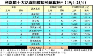 利嘉閣地產董事陳大偉表示,近日多個矚目新盤陸續推出,市場聚焦一手,搶去部分二手客源。加上二手屋苑盤源持續減少,業主逐漸收窄議價空間,令樓價進一步上揚,二手成交量暫未見大突破。綜合利嘉閣地產分行數據所得,全港十大活躍指標屋苑在上周(19/4–25/4)錄81宗買賣個案,較前周(12/4–18/4)的80宗按周微升1%,平均每個屋苑錄得約8宗成交。