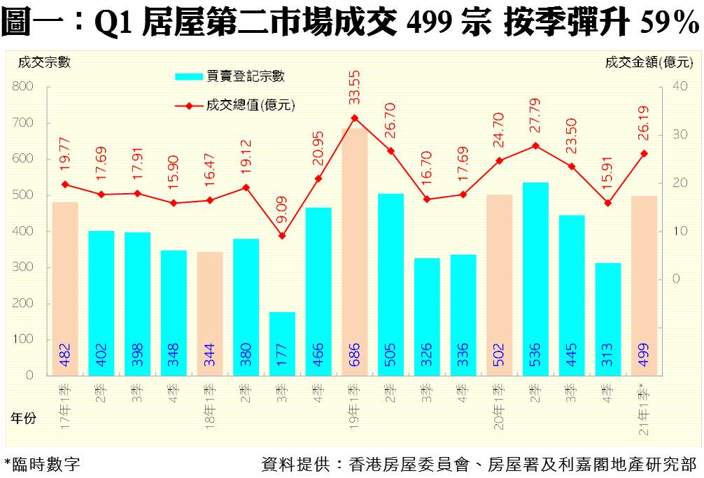 利嘉閣地產研究部主管陳海潮表示,受惠疫苗展開接種,憧憬經濟活動可望重啟,買家入市信心明顯回升,今年首季樓市氣氛非常暢旺,居屋第二市場交投表現造好。根據香港房屋委員會及房屋署網頁最新數據,綜觀2021年首季全港共錄得499宗居屋第二市場買賣個案(按簽署臨時買賣合約的成交為準),較去年第四季的313宗反彈59%,屬近3季最多;而同期物業成交總值約26.19億元,按季急增65%,同屬近3個季度最高。