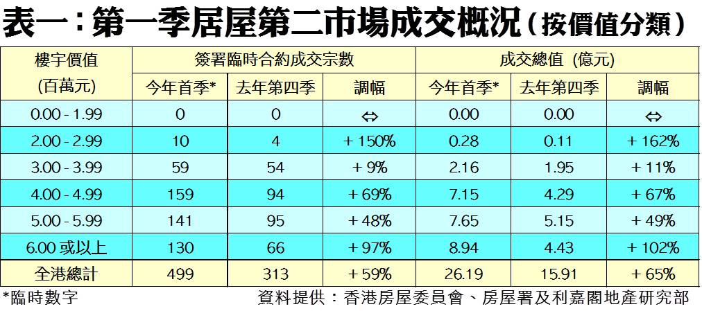 按物業價值劃分(見表一),價值600萬元以上的「貴價」組別,成交宗數按季急升97%至130宗買賣,涉及總值8.94億元。至於交投量最活躍的價值400萬元至499萬元組別,錄得159宗買賣個案,涉及7.15億元,量值按季分別增加69%及67%。若按屋苑劃分(見表二),天水圍天頌苑為首季最熱賣屋苑,共錄24宗買賣,按季增加118%,而涉及成交總值約1.29億元,按季增加180%。