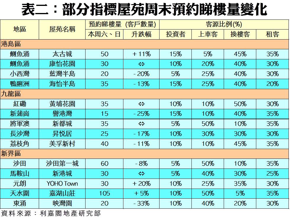 利嘉閣地產研究部主管陳海潮表示,二手屋苑盤源持續消耗,加上多個新盤同時登場,攤薄市場購買力,導致今個五一周末預約睇樓量受壓。根據利嘉閣地產研究部數據估算,全港50個指標屋苑共錄1,460組客戶於周末預約睇樓,按周下跌2.3%,連跌四周。發展商積極推盤,樓市氣氛依然旺盛,惟二手需時「回氣」補充盤源,料短線較受壓。