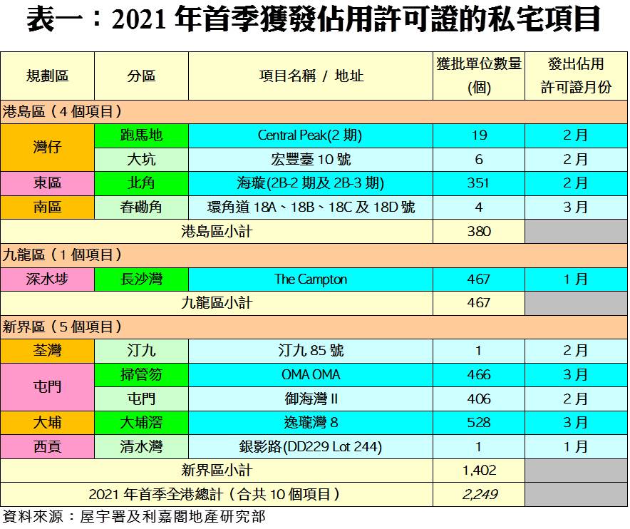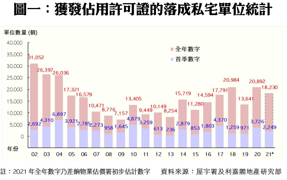 利嘉閣地產研究部主管陳海潮表示,今年私樓落成進度仍然緩慢,根據屋宇署今天最新發表的資料月報顯示,2021年三月份全港共有3個項目,共998個私人住宅單位落成(以屋宇署發出佔用許可證的樓宇數量為準),雖較二月份783伙增加27%,但連續3個月不足千伙。另外,今年首季共有10個項目、涉及2,249伙私宅落成,較去年同期的3,726伙按年大減4成,佔差估署全年預測僅12%。