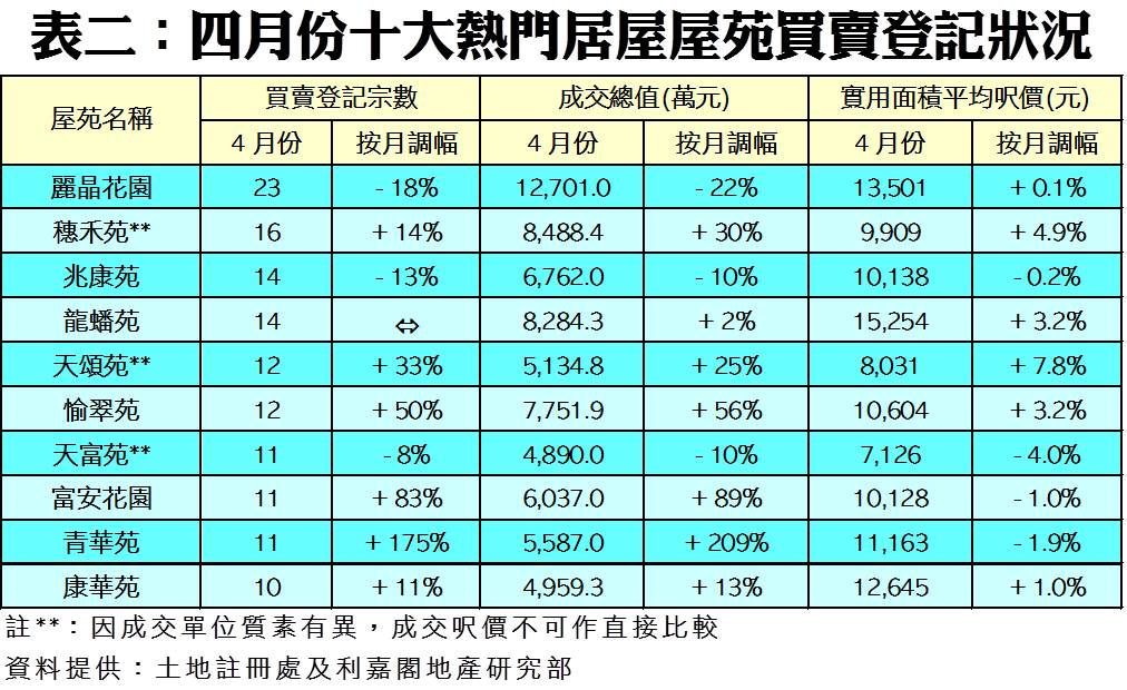 如按屋苑細分(見表二),四月份青衣青華苑共錄11宗買賣,按月急增1.75倍,升幅最為顯著;至於,九龍灣麗晶花園上月錄得23宗登記,較三月份減少18%,成為上月成交最活躍的居屋屋苑,而期內成交總值為1.27億元,按月回落22%。