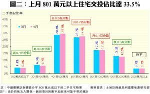 細看四月份數據,在7個銀碼組別中(見圖二),中細價物業的兩大主流銀碼佔比均見上升,其中銀碼介乎401萬至600萬元物業的升幅最大,佔比由28.6%增加0.9個百分點,至29.5%;而銀碼介乎601至800萬元者亦升0.7個百分點至27.4%。反之,中高價物業交投佔比升幅相對遜色,其中銀碼介乎801萬至1,000萬元的組別只錄得0.1個百分點的輕微升幅,達17.3%;而1,001萬至2,000萬元及2,000萬元以上者則分別回落0.5個百分點至12.5%及持平在3.7%,導致整體中高價物業買賣佔比微降。