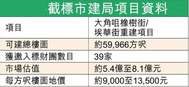 市區重建局公布,大角咀橡樹街/埃華街重建項目共接獲14份標書。