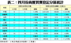 值得注意的是,在5,000萬元或以上的大銀碼商廈交投大增下,刺激四月份商廈買賣登記金額大幅倍升,錄約53.31億元,按月激增3.84倍,登記金額連升兩月,為過去半年以來第二多的月份。此外,四月份最矚目的單一登記項目為中環交易廣場富臨閣全幢,涉及合約金額25.68億元;其次為上環CentreHollywood全幢,涉及登記金額達5.4億元。