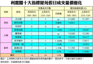 《利嘉閣十大指標屋苑假日二手實況》 二手盤缺交投轉慢 市場聚焦一手大盤 十大屋苑周末錄19宗買賣 近3周最少