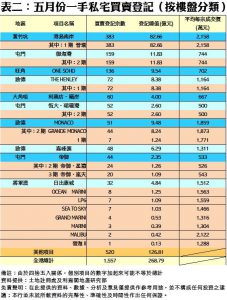 按樓盤分類(見表二),港島南岸1期晉環上月共錄383宗登記,成為五月份登記量最多的一手私宅項目,登記總值達82.66億元,平均每宗登記約2,158萬元;次名為屯門御海灣2期的159宗,而第三則是旺角ONE SOHO的136宗登記。至於排行榜內上月平均每宗買賣成交價最高者為晉環的2,158萬元,而屯門恆大‧珺瓏灣2期的500萬元則成為較低平均價者。