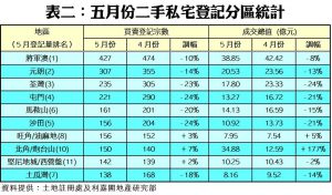 今年五月份,按二手私宅價值分類(見表一),9個價格組別的買賣登記量錄得五跌四升,跌者當中,以601萬至800萬元的組別跌幅最大,由四月的1,572宗減少20%,至上月的1,263宗;其次,301萬至400萬元的組別亦跌17%至260宗。此外,樓價401萬至600萬元的組別亦錄得15%的按月增幅,五月共有1,228宗登記,反映中細價物業貨源經連月消化後,正處回氣階段。