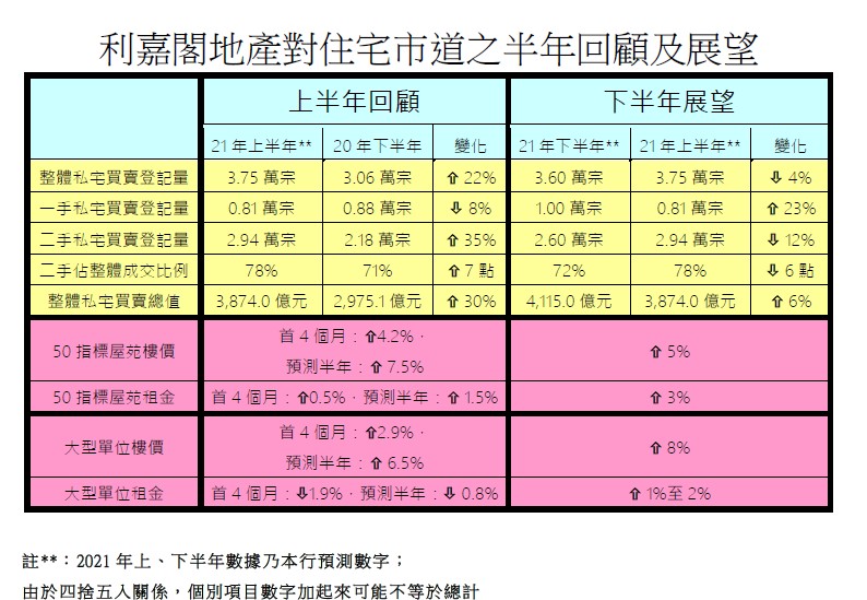 廖偉強表示,甫踏入2021年以來,新冠疫情略有放緩,發展商積極推盤,結果收票反應十分理想,連二手市場亦被帶旺,造就樓市「小陽春」提早出現,其後新冠疫苗於二月底開始接種,令樓市升浪進一步延展。綜合土地註冊處數據,2021年首5個月,整體私宅買賣登記共有30,176宗,涉及金額約3,024.88億元,預計連同六月份的整個上半年最終可達37,476宗及3,874.04億元,較2020年下半年分別上升22%及增加30%,當中登記總值更創下1996年有紀錄以來的歷史新高!
