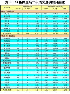 五月份樓市氣氛維持良好,一手二手並駕齊驅,在新盤熱賣下,二手亦維持不俗的吸納量,反映整體需求旺盛。五月全月50指標屋苑交投持續突破千宗水平,錄得1,034宗,雖按月回落3%,但已連續三個月高企逾千宗水平,為2014年八月共6年多以來最旺的市況。全港三區交投量中,新界區按月跌6%,錄432宗買賣;九龍區買賣也跌4%,全月有406宗,而港島區則升4%,錄得196宗成交。月內交投最旺指標屋苑為嘉湖山莊,共錄得68宗成交,而太古城及沙田第一城則分別錄51宗及48宗。