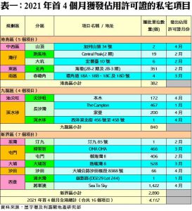 根據資料顯示,四月份本港共有6個私宅項目正式落成,當中規模較大的為日出康城「Sea To Sky」,涉及1,422個單位;其次為長沙灣「家壹」,涉及單位200伙;至於尖沙咀「本木」(172伙)、大埔公路沙田嶺段8388號(66伙)、山頂加列山道34號(2伙)及深水埗西洋菜北街456號至458號(1伙)亦於期內竣工(詳見表一)。