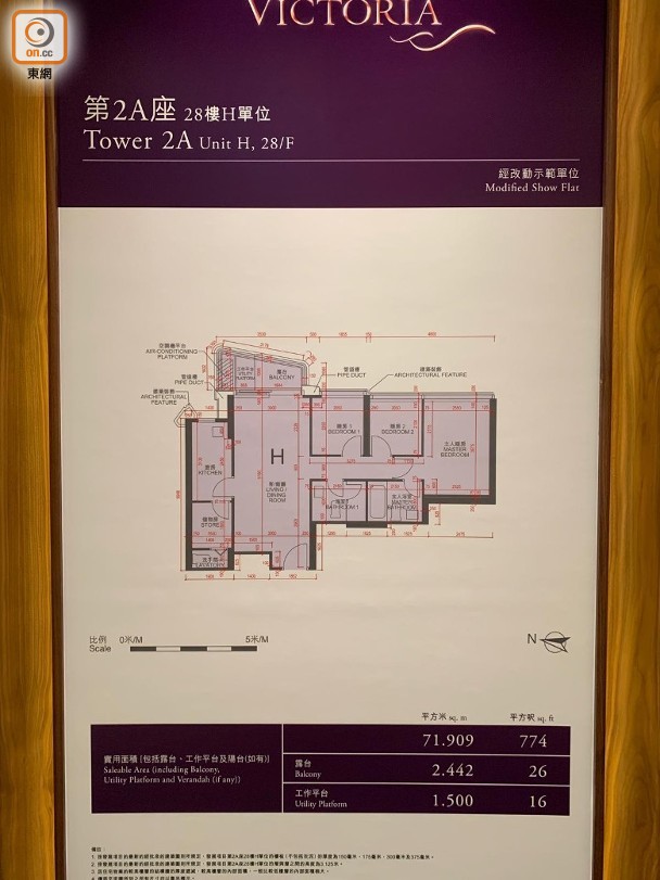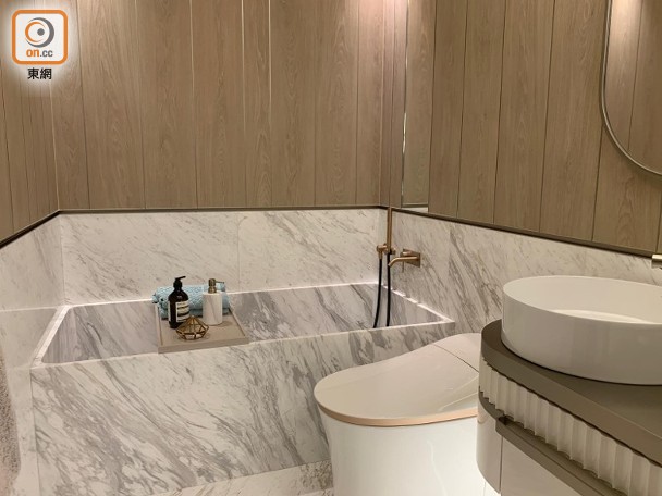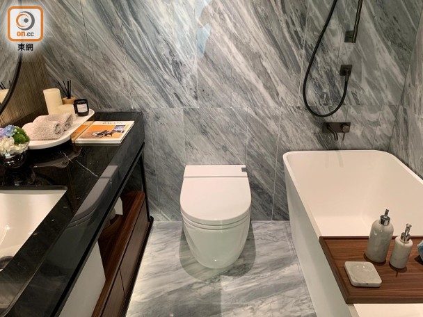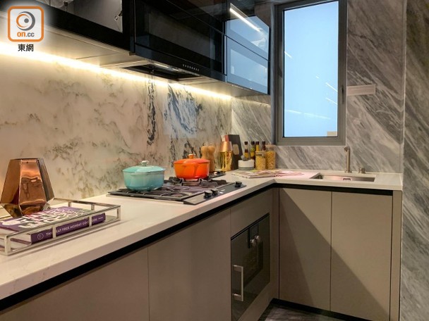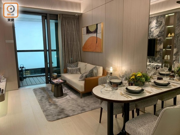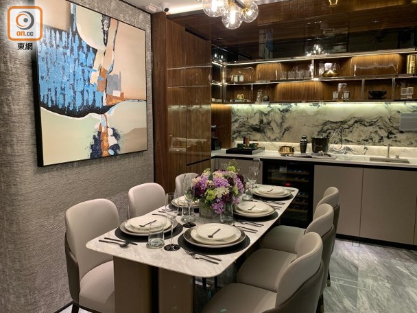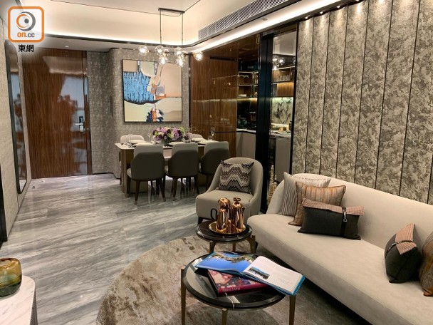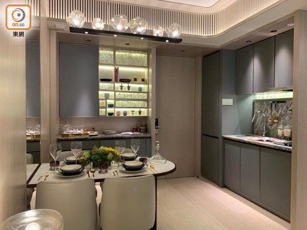 至於根據第2A座28樓H室打造的原則三房單位,實用面積774方呎,廚房原本為傳統獨立「梗廚」,內設儲物房及洗手間,設計師將示範單位內有關空間打通,令廚房可用性提高。該單位長方形大廳闊落,亦連接面積26方呎露台及16方呎工作平台;而主人套房與毗連睡房亦打通,擴展成特大套房。