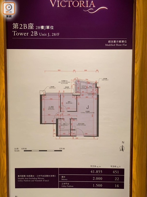 多個大型新盤醞釀登場。中國海外發展(00688)旗下啟德維港1號今日(23日)首度安排傳媒參觀示範單位,其中參照第2B座28樓J室搭建的兩房戶,實用面積451方呎,廚房屬開放式設計,大廳連接面積22方呎露台與16方呎工作平台。主人房空間充足,可容納大型雙人床。