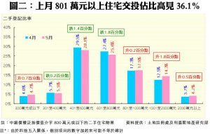 細看五月數據,在7個銀碼組別中(見圖二),中細價物業的兩大主流銀碼佔比均見下跌,其中銀碼介乎601至800萬元物業的跌幅最大,佔比由27.4%減少1.8個百分點,至25.6%;而銀碼介乎401萬至600萬元者亦跌1.4個百分點至28.1%。反之,中高價物業交投佔比全線上升,其中銀碼介乎1,001萬至2,000萬元的組別錄得1.8個百分點的最大升幅,達14.3%;而801萬至1,000萬元及2,000萬元以上者亦分別上升0.2及0.5個百分點至17.5%及4.2%,帶動整體中高價物業買賣佔比再創歷史新高。