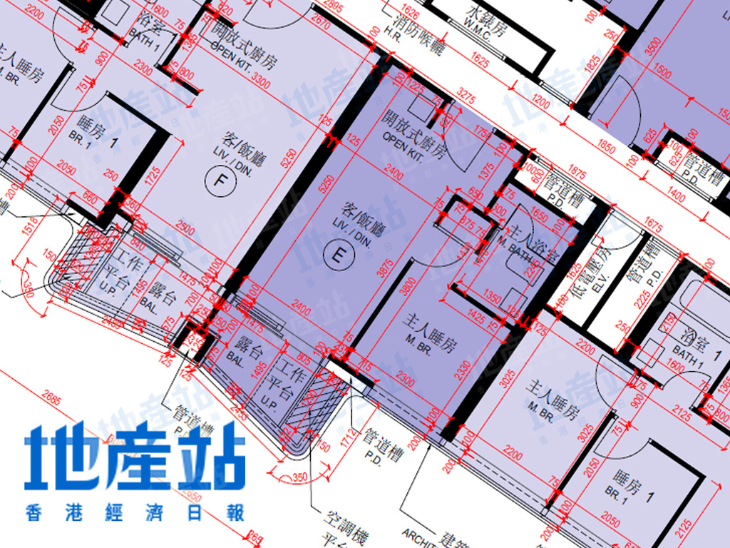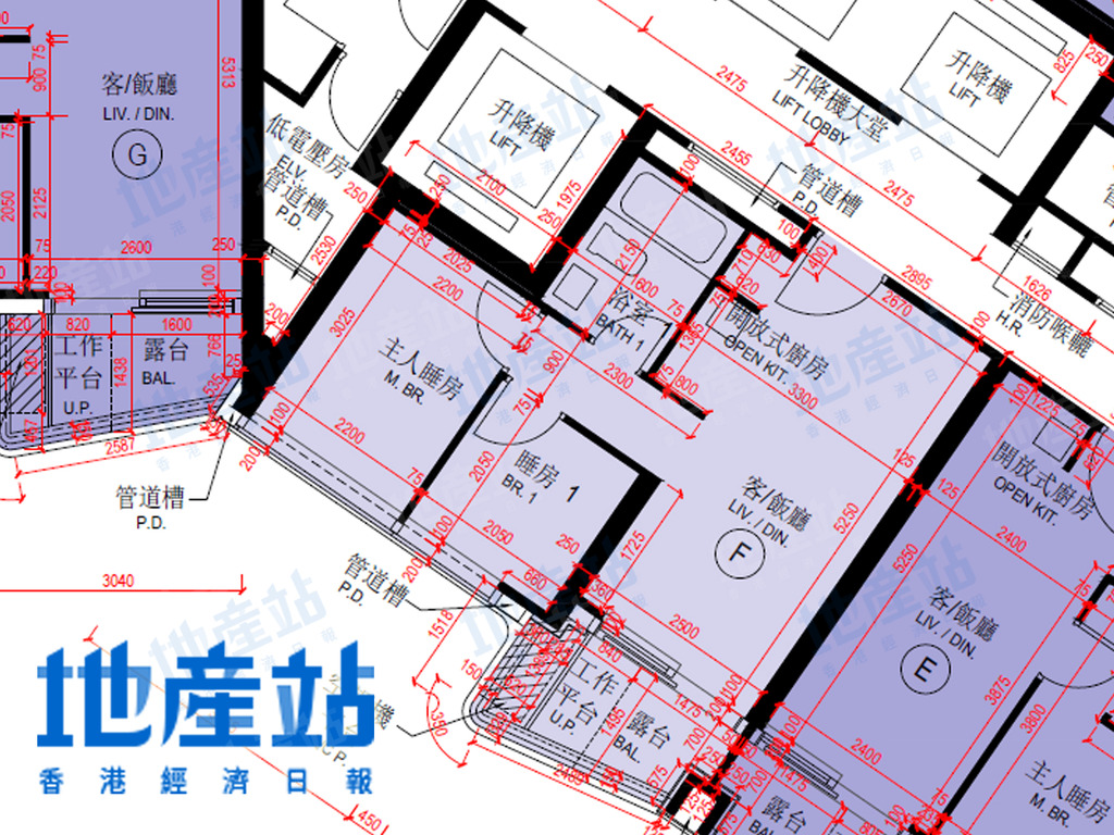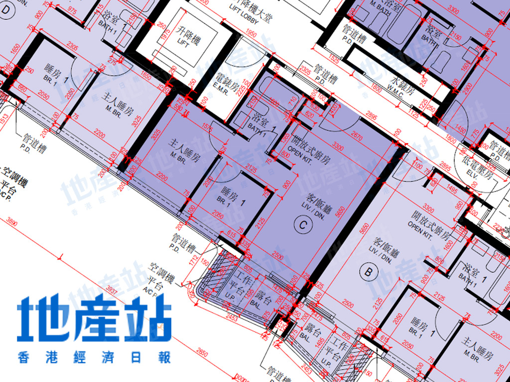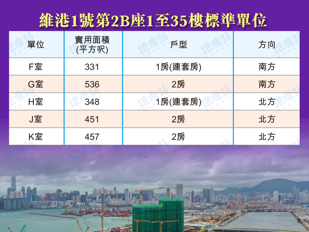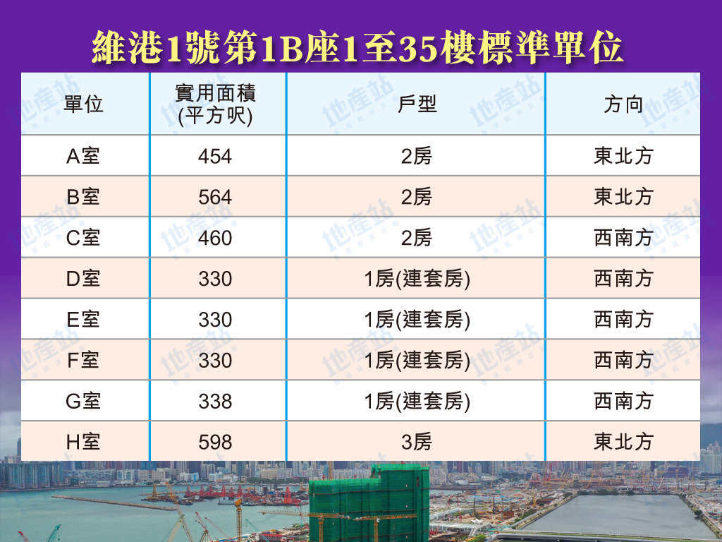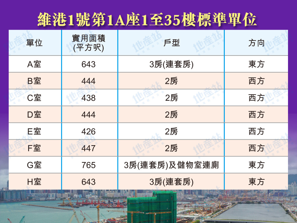 維港1號1B座1至35樓為例,1層共8伙單位,可以方向劃分,包括東北方及西北方單位。東北方單位有3伙,包括A室、B室及H室,包括2房及3房單位。